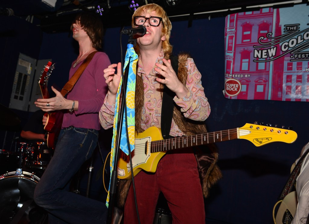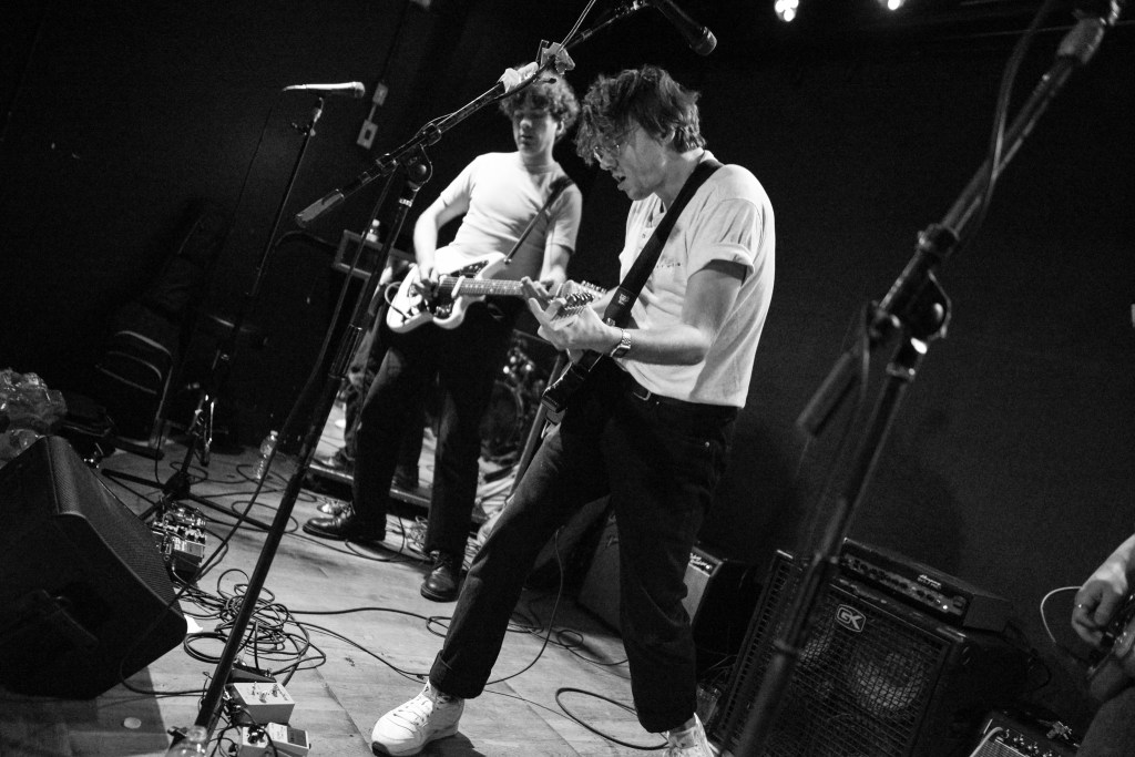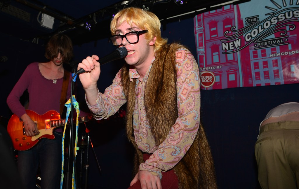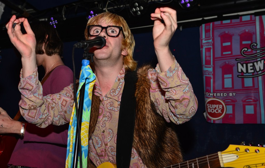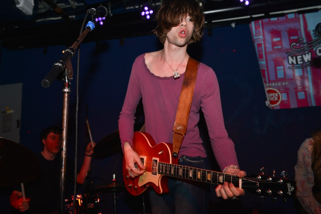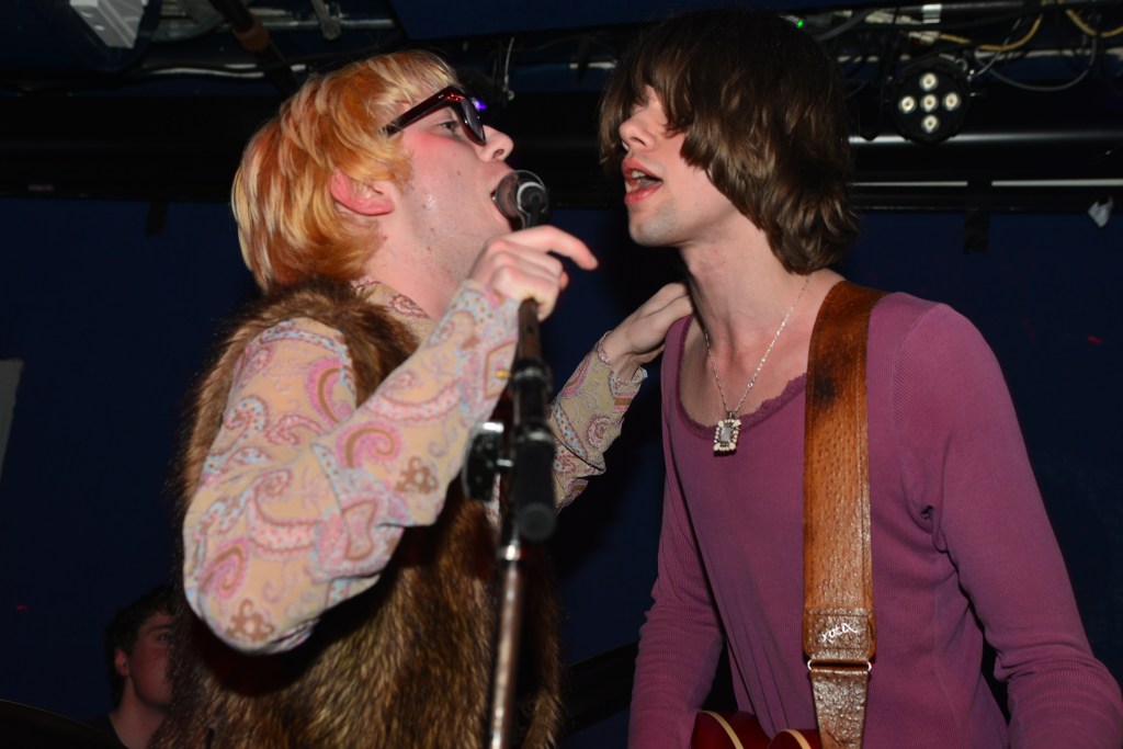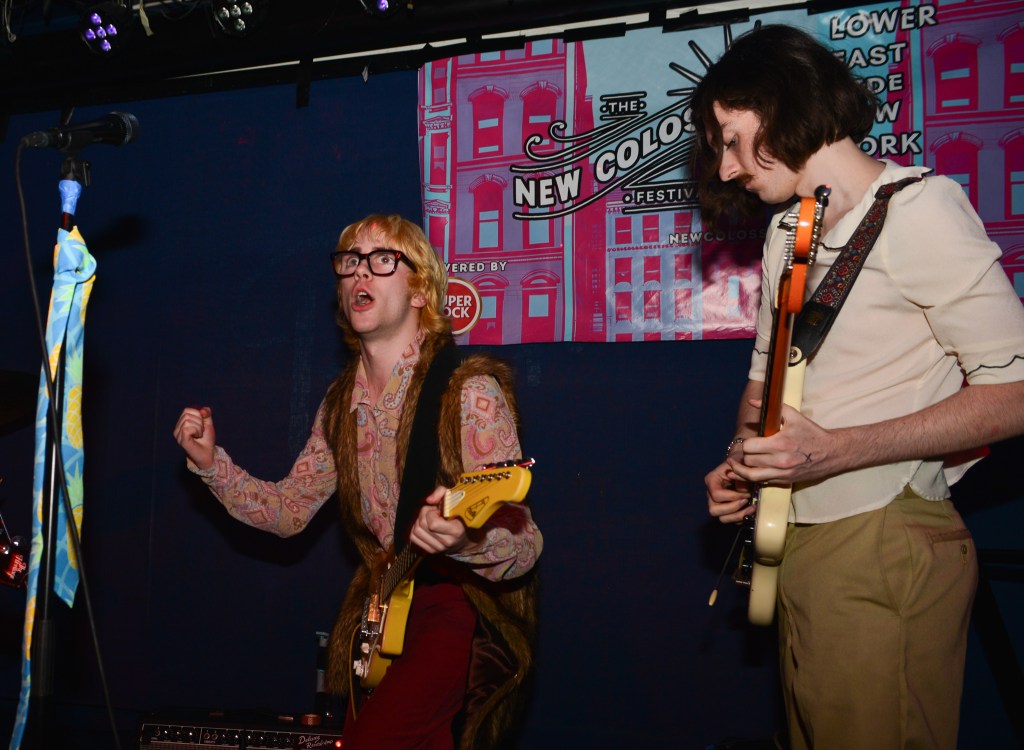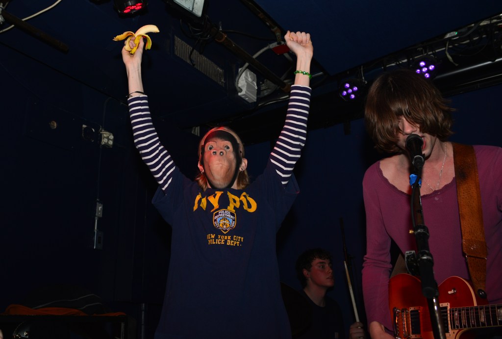 Thursday night would be another great night of music for me. The weather which had been pretty miserable on Wednesday night cleared up enough so that it was way more conducive to venue hopping, something which New Colossus is made for. I would ultimately get to catch six bands at 5 different venues on Thursday night, three of which really stood out. One of those would be NOBRO which I won’t get into. The other two were coincidentally both from the UK. I originally had low expectations for Canned Pineapple mainly because of their band name, I mean its a terrible band moniker. But then they took the stage and it was like getting slugged over the head with a rubber mallet. Fronted by lead singer, songwriter, guitarist and chief hooligan, Sean Drury, Canned Pineapple were a tour de force. A 100% irreverent tour de force at that, and just like that the band name of Canned Pineapple made perfect sense. These British lads were completely absurd. They hammed it up and made no pretense that playing here in NYC for the first (and as Drury tongue in cheek stated, “probably the last”) time was going to be nothing but a barrel full of monkees. Hell they even brought along their very own gorilla across the pond for these shows. I know their press release calls their music skuzz rock but witnessing their set on Thursday night my first thought was manic pub rock. Yeah, pub rock like Brinsley Schwartz used to make, but at a breakneck pace. This brings me to frontman Sean Drury. With a mop-top of bleach blonde hair and thick horn rimmed glasses, your first impression might be a young Elvis Costello. A young Elvis without the anger and angst however. Drury, from the get-go was all about rock and roll party music. Then it hit me, Drury was the illegitimate spawn of Costello and Keith Moon. I mean this kid was crazed up on stage. At first I thought he might be drunk as a skunk but then I noticed the sharpie X’s on many of the band’s hands and I realized these kids more than likely weren’t even old enough to drink here in NY. Nonetheless, Drury and guitarist Gabriel Rice (with his Brian Jones haircut and Mick Jagger stature) were nonstop dervishes of energy. Belting out such hilarious songs as “She’s Got A Car”, “Why Don’t The Pretty Women Like Me”, “King Of The Monkeys” and “Shuba Dooba” to name a few had the crowd howling back at the band like we’d known these songs forever. These dudes were an absolute blast to watch and experience and I immediately knew I was going to have to juggle around my upcoming schedule in order to catch the rest of their sets in the coming days.